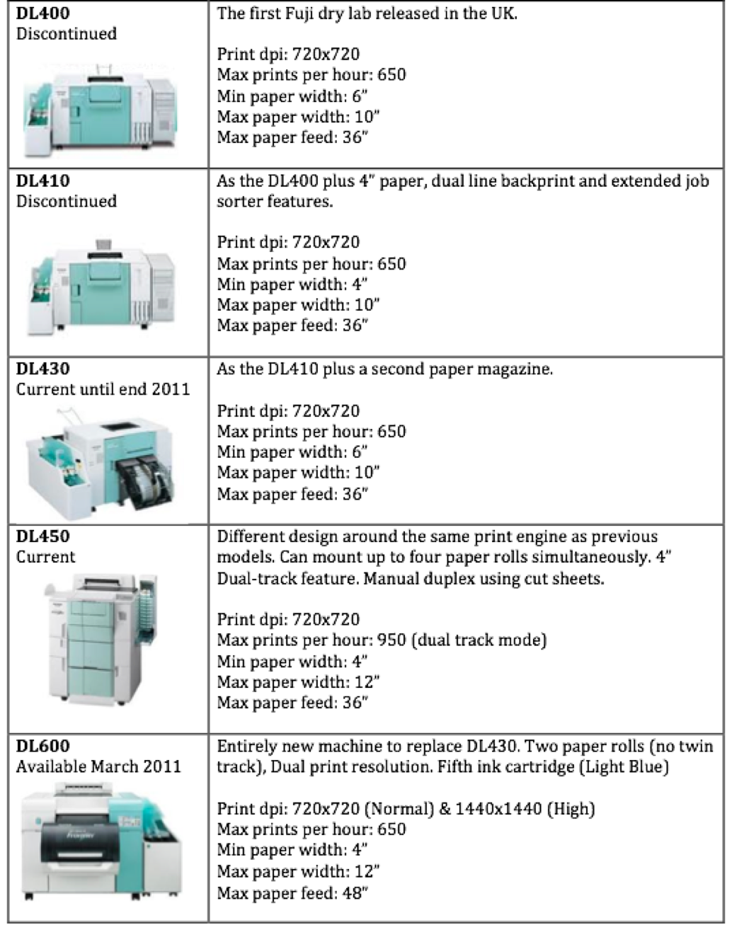 The Fujifilm dry lab range started in early 2008 with the DL400. This machine was a direct result of the 2006 “Global Alliance in Photofinishing” between Fujifilm and Noritsu. The underlying print engine and chassis of the DL400 was based on the Noritsu M300 which was unleashed on an unsuspecting world mid 2007.