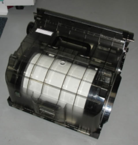 Paper rolls are first loaded in to a large, moisture-resistant cassette which is very similar to the light-tight cassettes used by the Frontier wet labs. Cassettes can be swapped in and out of the printer as needed.