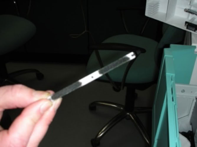 Just like the dry lab’s “wet” predecessors, there is a small device that prints on the back of each print. This has a typewriter-style fabric ink ribbon through which it prints lines of dot-matrix characters. This ribbon winds back and forth and eventually gets used up - signalled by the back-print getting faint. Renewing the ribbon is a simple matter of unclipping the printer module and changing the small cartridge.