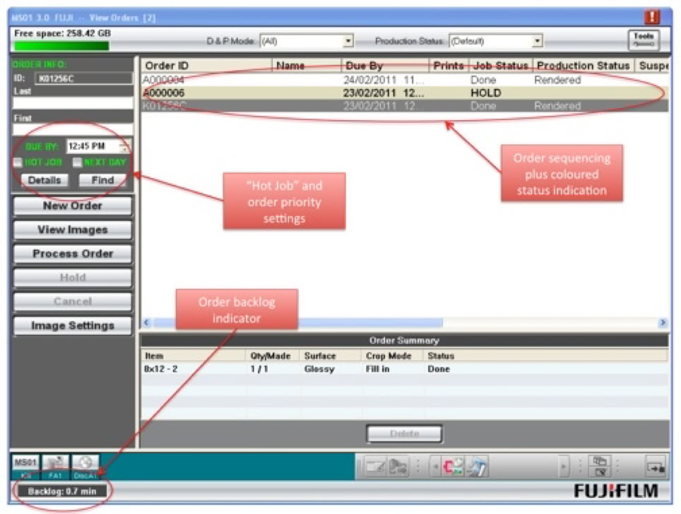 The key task of the MS application is to manage print jobs. These jobs could originate from kiosks, the internet and the lab itself using images from attached scanners, media readers, etc.