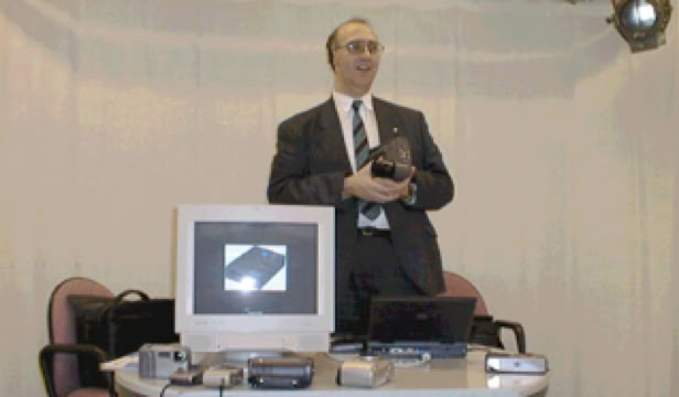 Nigel and I then set about running presentations and demonstrations to every company, public service, photographic organisation and educational establishment that would have us (which was rather a lot!). This entailed lots of out of hours as well as travelling around the country. On the right is a picture of me in flight during a presentation in 1996.